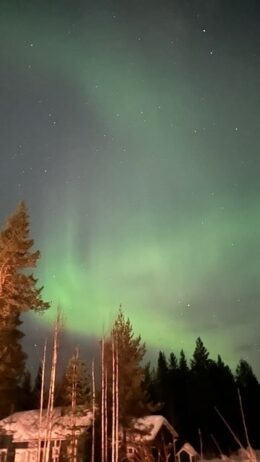 Jos matymui nebūtini brangūs turai – ryškiausią pašvaistę matėme tiesiog išėję iš namelio.